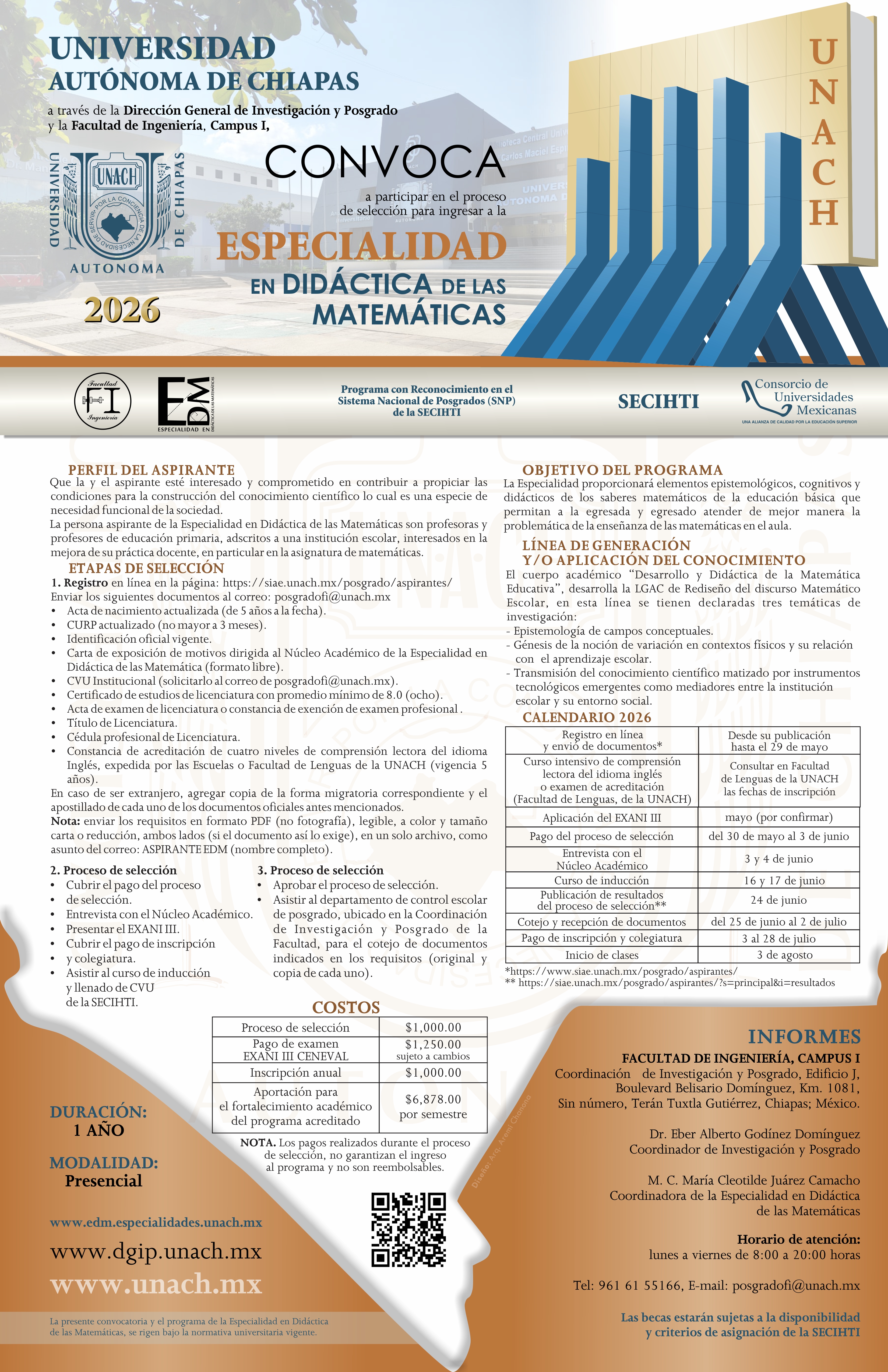 La especialidad en Didáctica de las Matemáticas, tiene por objetivo formar a especialistas en Didáctica de las Matemáticas, quienes a lo largo de sus estudios de formación se familiarizarán con elementos epistemológicos y didácticos de los saberes matemáticos de la educación básica que les permitirán atender la problemática de la enseñanza de las matemáticas en el aula.